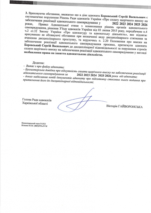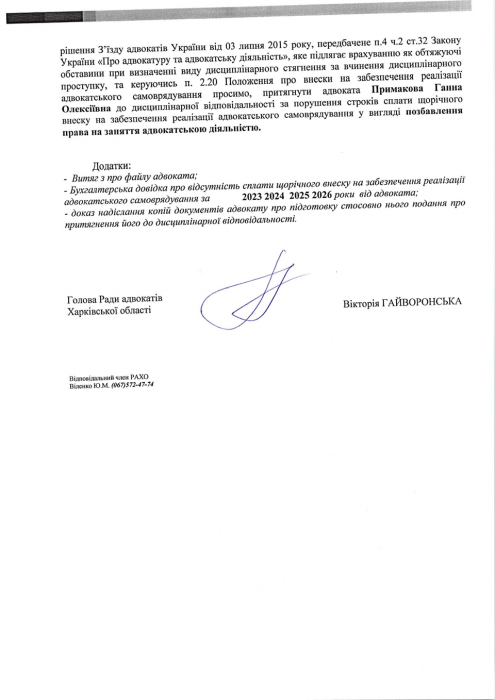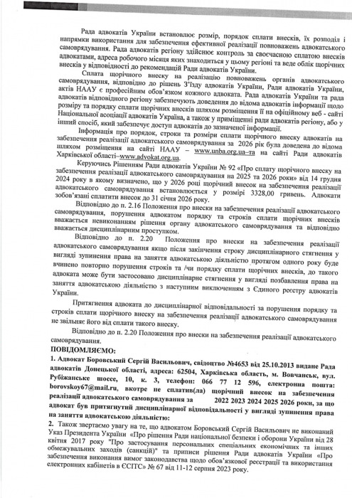На виконання Рішення №4/1/1 від 08.04.2026 р. Ради адвокатів Харківської області «Про повідомлення адвокатів щодо направлення відносно них подання до Кваліфікаційно-дисциплінарної комісії адвокатури Харківської області, робоче місце яких згідно відомостей Єдиного реєстру адвокатів України розташоване на тимчасово окупованій території а також відомості електронної адреси розташовані на платформах російських поштових сервісів https://mail.ru та https://ya.ru використання яких заборонено в Україні» з метою належного повідомлення таких адвокатів про направлення відносно них подання до Кваліфікаційно-дисциплінарної комісії адвокатури Харківської області про притягнення їх до дисциплінарної відповідальності за порушення порядку та строків сплати щорічного внеску на забезпечення реалізації адвокатського самоврядування.