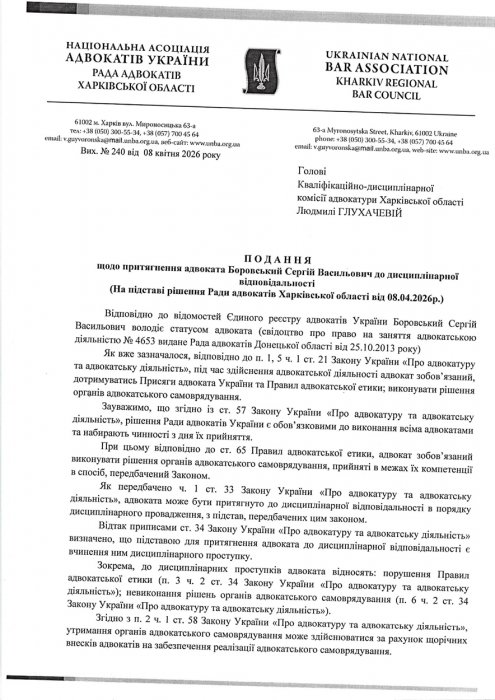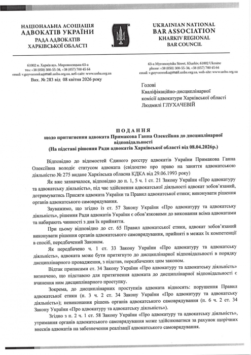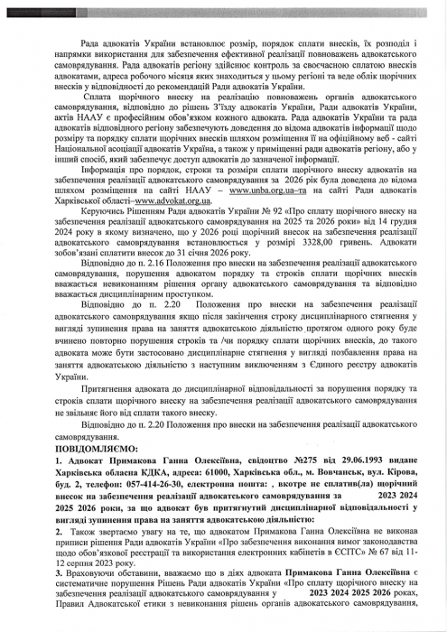 На виконання Рішення №4/1/1 від 08.04.2026 р. Ради адвокатів Харківської області «Про повідомлення адвокатів щодо направлення відносно них подання до Кваліфікаційно-дисциплінарної комісії адвокатури Харківської області, робоче місце яких згідно відомостей Єдиного реєстру адвокатів України розташоване на тимчасово окупованій території а також відомості електронної адреси розташовані на платформах російських поштових сервісів https://mail.ru та https://ya.ru використання яких заборонено в Україні» з метою належного повідомлення таких адвокатів про направлення відносно них подання до Кваліфікаційно-дисциплінарної комісії адвокатури Харківської області про притягнення їх до дисциплінарної відповідальності за порушення порядку та строків сплати щорічного внеску на забезпечення реалізації адвокатського самоврядування.